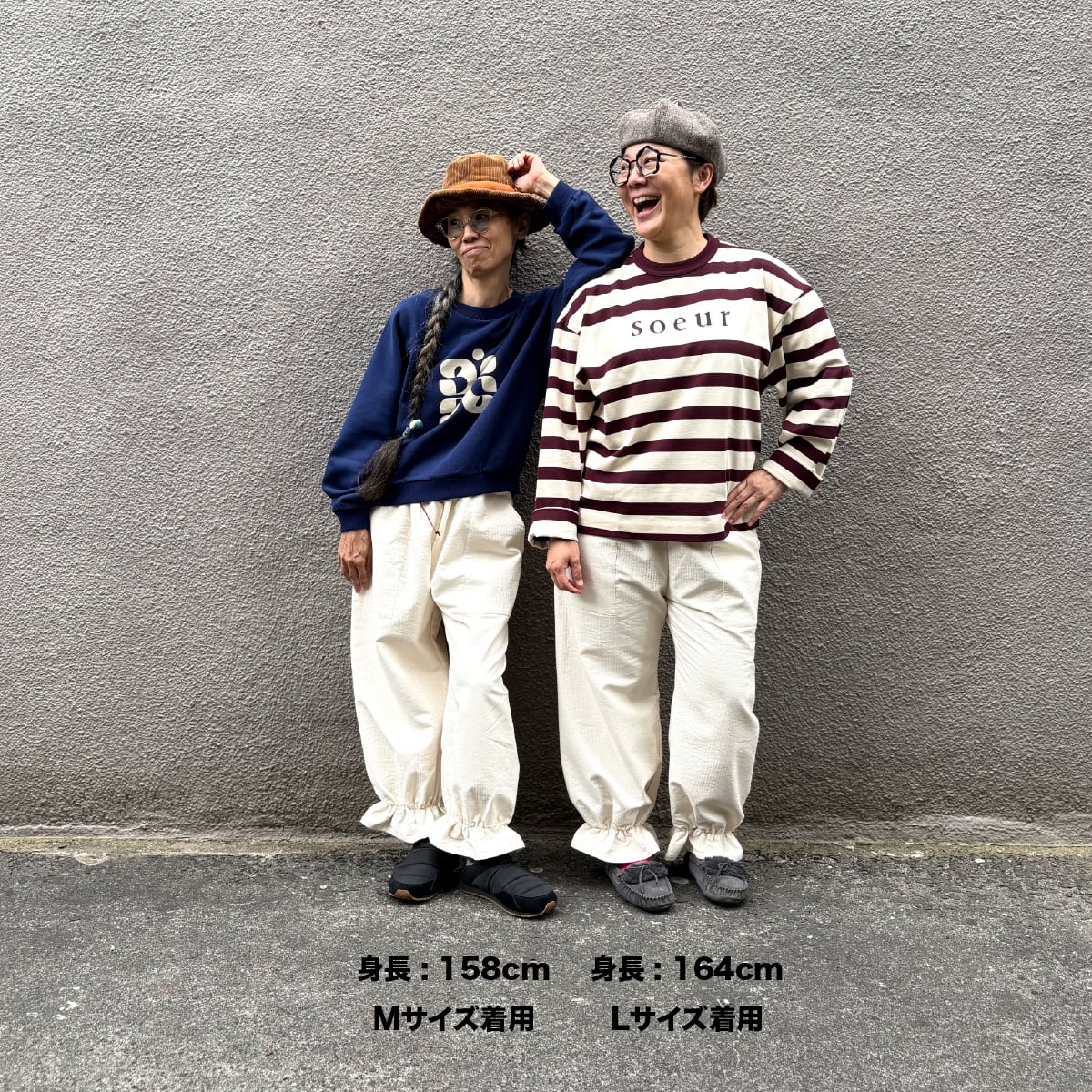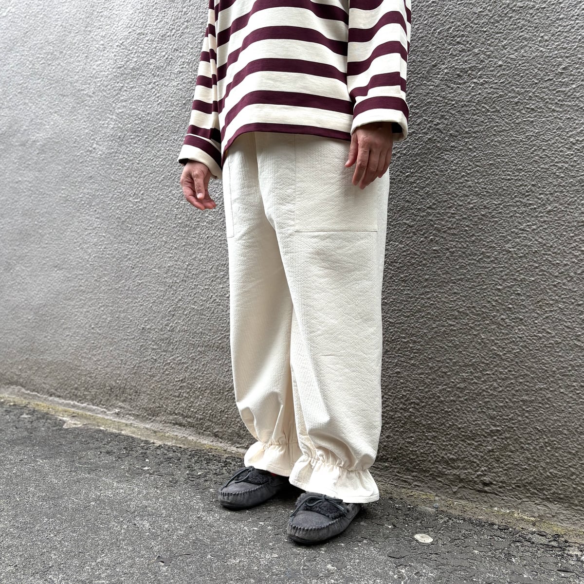裾を絞ることで冷たい風を防ぎつつ、足元にはリズムのある表情を生み出します。