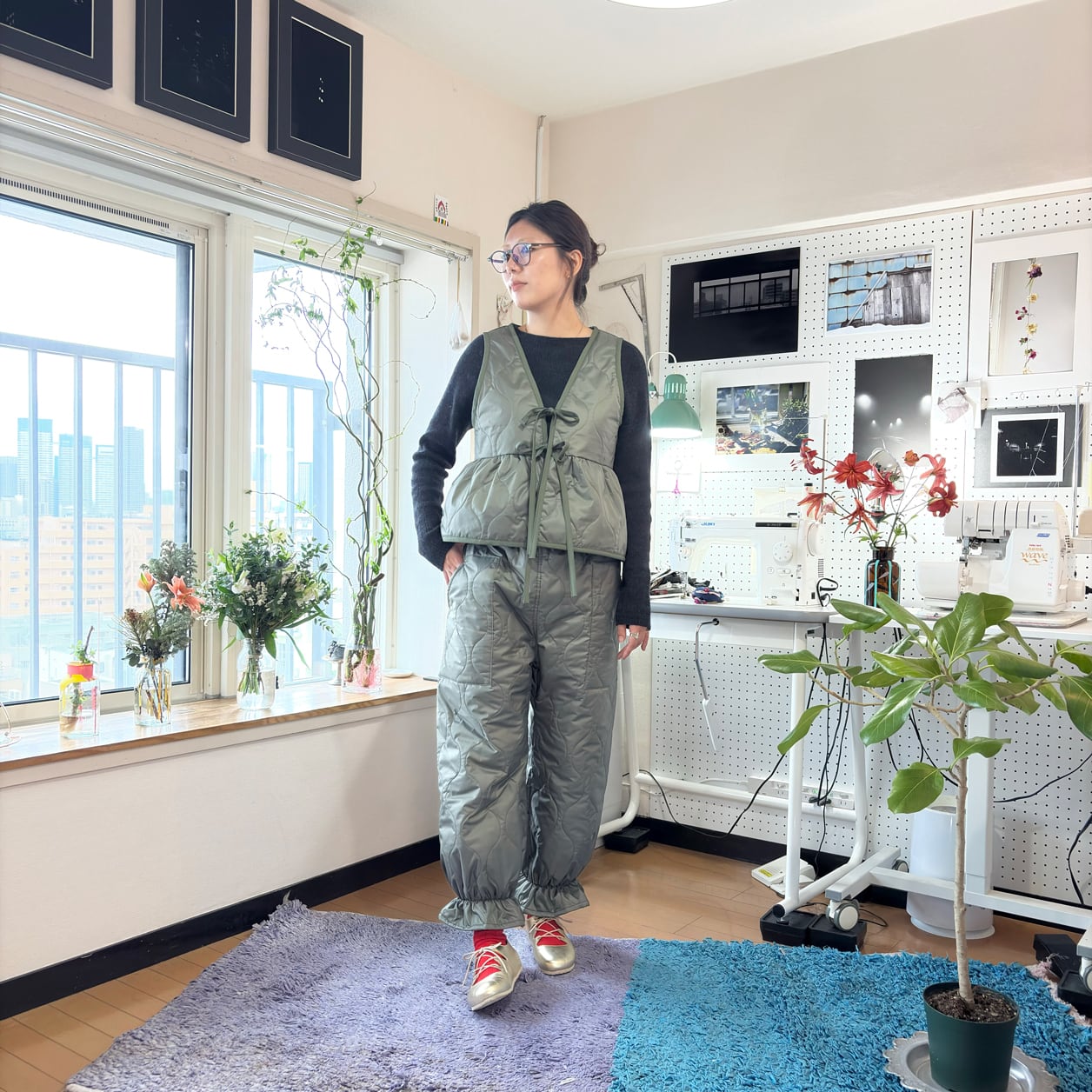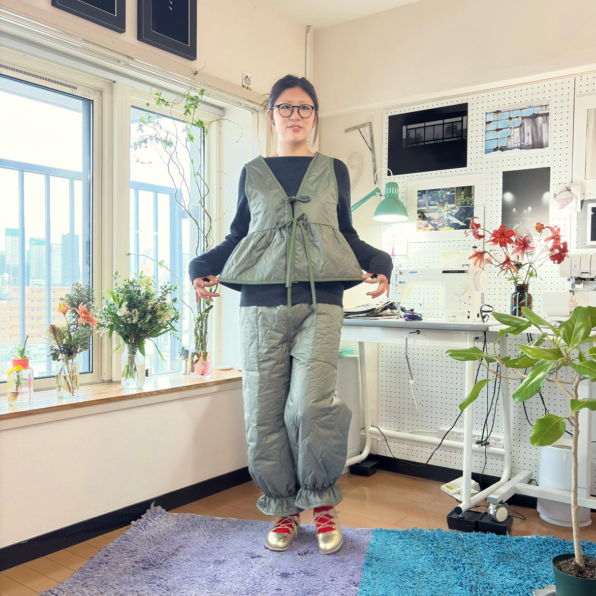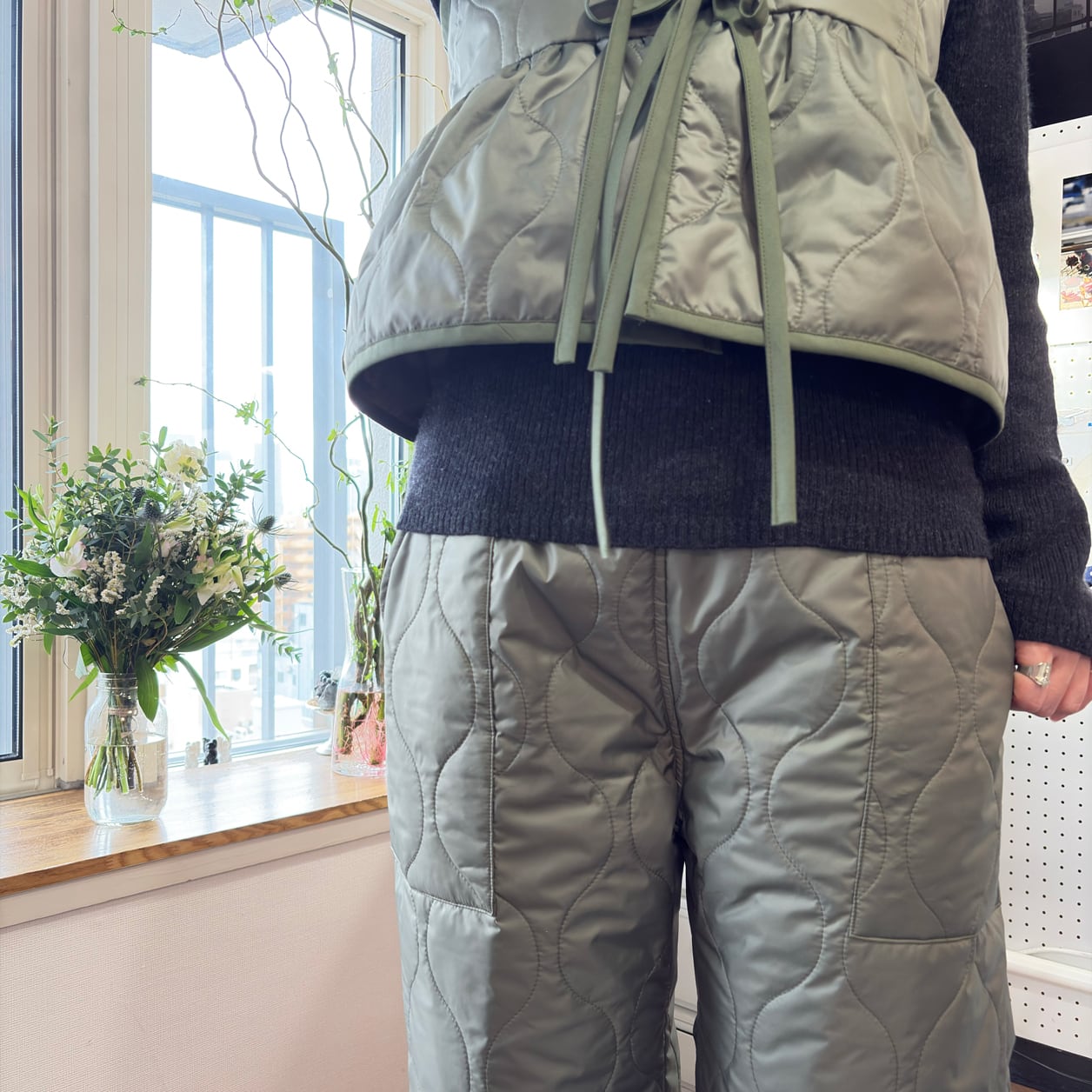 同素材のキルティングベストと合わせた