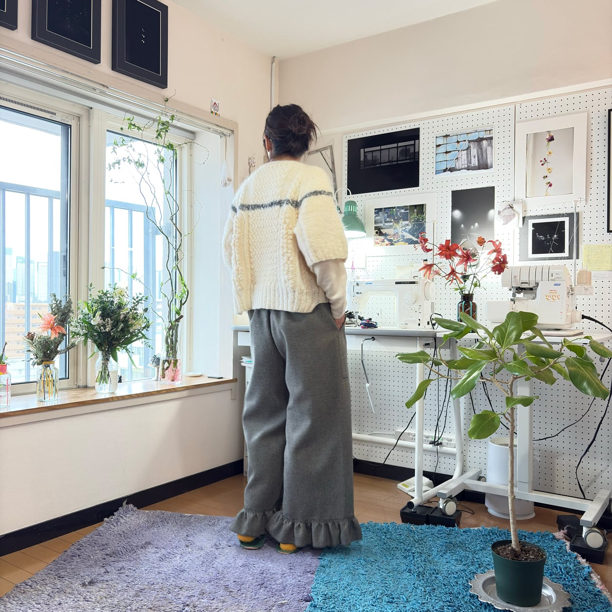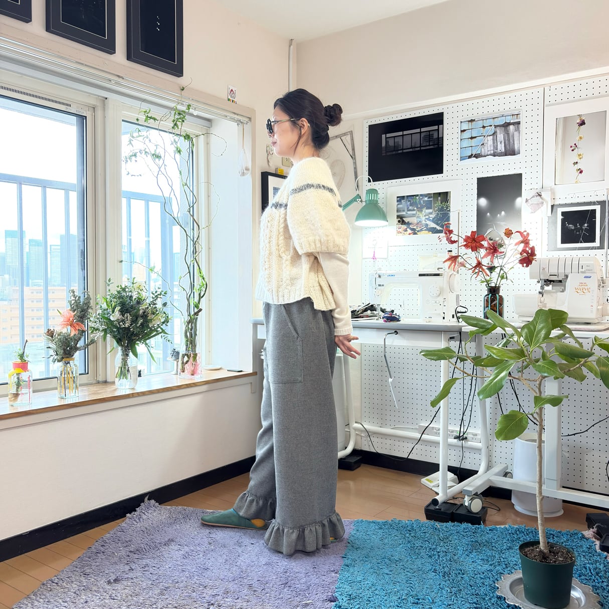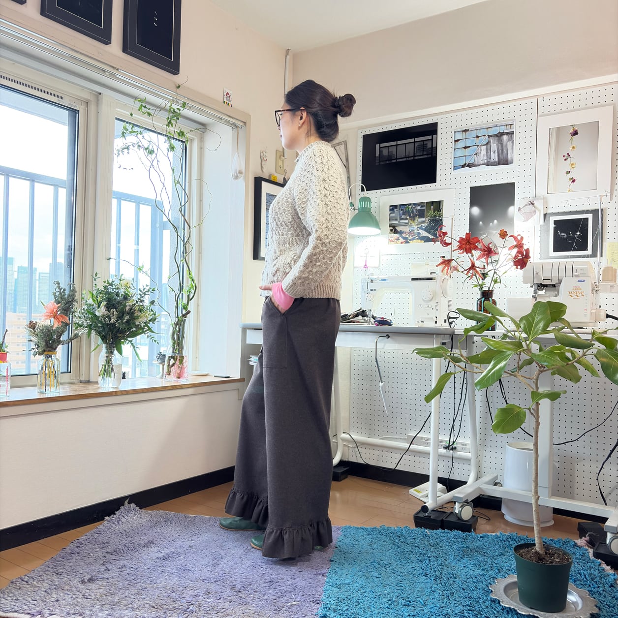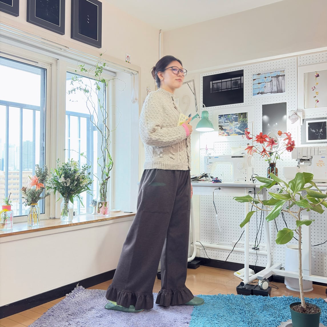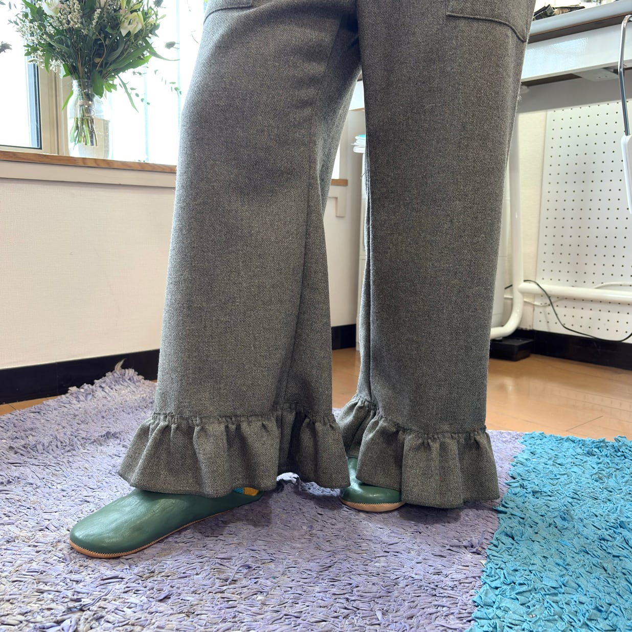 シンプルなワイドシルエットに、裾のフリル切り替えが